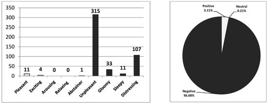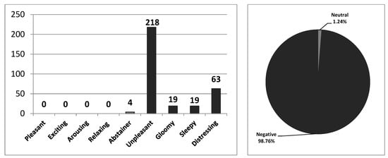 On the other hand, 122 different varieties of sensory metaphors were produced by subjects. There were no positive senses, 4 of them were a neutral sense, and 118 sensory metaphors were classified as negative senses. In total, 323 sensory metaphors were produced and 0 of them were positive (pleasant—0, exciting—0, arousing—0, and relaxing—0), 4 of them were neutral (abstainer—4), and 319 sensory metaphors were negative (unpleasant—218, gloomy—19, sleepy—19, and distressing—63). This means that 0% were positive senses, 1.24% were neutral senses, and 98.76% were negative senses out of the total number of sensory metaphors (Figure 10). The authors have listed the metaphors that were above the average value as a result of these vast numbers of sensory metaphor findings (Table 4).