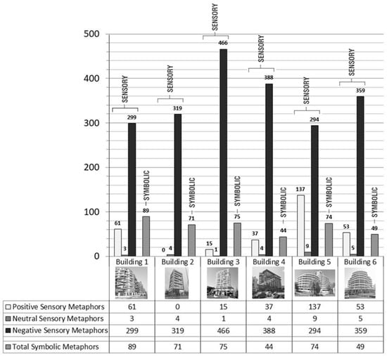 As a result of the experimental research, it was observed that subjects generated various sensory metaphors. For this reason, the research used the “Scales of the affective quality attributed to places measure” of Russell and Pratt [71] to define, classify, and to make the recorded sensory metaphors more comprehensible, as defined in the research method section. Russell and Pratt used the measure for testing the built and natural environments. The measure was formulated by 40 items in total and had 8 scales. Four scales were positive senses (arousing, exciting, pleasant, and relaxing) and four scales were negative senses (sleepy, gloomy, unpleasant, and distressing). After the investigation of the method and application of case studies, the authors realised that the subjects could create neutral experiences as well apart from positive and negative. Therefore, neutral senses classification was included into the classification system. The sensory metaphors were obtained from the transcription of the 30 subjects and they were classified under the three listed titles (positive, neutral, and negative sensory metaphors) according to the measure of Russell and Pratt. This gave the opportunity to measure and understand the subjects’ architectural experience on the selected case studies. These findings were transformed into statistical data, which are represented by pie charts and graphical illustrations. Accordingly, the statistical results are discussed to understand the relationship between symbolic and sensory metaphors.