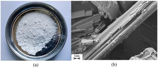The macro and micro morphology of CSW are shown in Figure 1. It can be found that CSW has obvious edges and corners under SEM, showing a rod-like structure; its surface is rough and uneven, which is mainly caused by the rapid precipitation of calcium sulfate whiskers in the growth process [,]; and there is partial agglomeration without surface treatment.