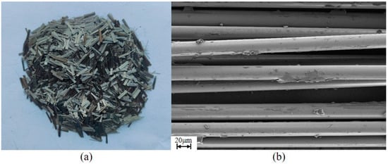At present, basalt fiber (BF) produced by various manufacturers can be divided into bundle BF and flocculent BF according to the dispersion. Among them, chopped strand BF, as a millimeter-grade fiber reinforced material, is made of natural basalt as raw material and cut into chopped fibers by continuous BF at a fixed length, which has the advantages of high tensile strength, excellent thermal stability, excellent corrosion resistance and good surface wettability []. In this study, the chopped BF produced by Changzhou Bochao Engineering Materials Co., Ltd., located in Changzhou, China, after surface treatment with silane coupling agent was used. The technical indexes of BF are shown in Table 2.