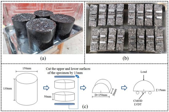 In this study, a superpave rotary compaction tester was used to form cylindrical specimens with radius: height = 75 mm × 130 mm, as shown in Figure 3a. Considering the difference in density between the top and bottom materials of rotary compaction specimens and the middle materials, before cutting semi-circular bending specimens, 15 mm was cut off from the upper and lower surfaces of cylindrical specimens; the remaining cylindrical specimens were cut according to the sample size of radius: height = 75 mm × 50 mm; and the two cut specimens were divided radially to make four semicircular specimens. Finally, the middle seam was cut at the bottom of each semicircular specimen, and the size of the middle seam was 15 mm × 1.5 mm. The semicircular bending specimen and its preparation process are shown in Figure 3b,c.