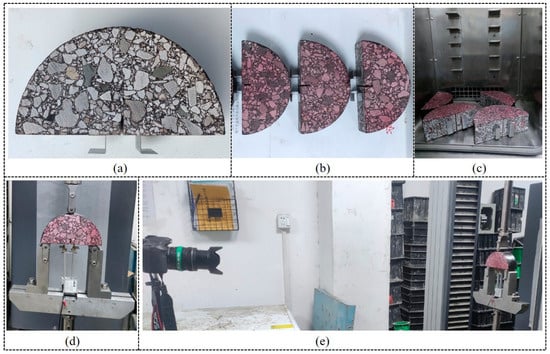 SCB test process (a) before specimen dyeing; (b) after specimen dyeing; (c) heat preservation of the test piece; (d) installation of extensometer; (e) camera video recording to record the cracking process.