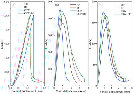 At the same temperature, the peak load of fiber asphalt mixture is larger and the vertical displacement at the peak is larger, which shows that fiber materials can enhance the tensile strength of the mixture and reduce the crack propagation speed after the peak load of the mixture. When the fiber is tested in a specimen with a large cross-sectional area, it shows excellent reinforcement and crack resistance. Before the peak load, the fibers in the micro-cracks adhere to the asphalt material, fixing the aggregate in the mixture, and the peak load is enhanced. After the peak load, the crack width increases and expands into the main crack. Because BF has excellent tensile strength and is distributed perpendicularly to the crack interface, even if the interface adhesion fails, the pull-out effect still exists, and the macroscopic performance is that the residual load increases [,]. Compared to the matrix asphalt mixture, the curve slope of CSW modified asphalt mixture before peak load is larger and the vertical displacement under peak load is smaller, which shows that CSW material can strengthen the interface adhesion between asphalt and aggregate and increase the stiffness modulus of asphalt. However, the modulus is too large, which also leads to faster crack propagation and poor toughness performance of the mixture.