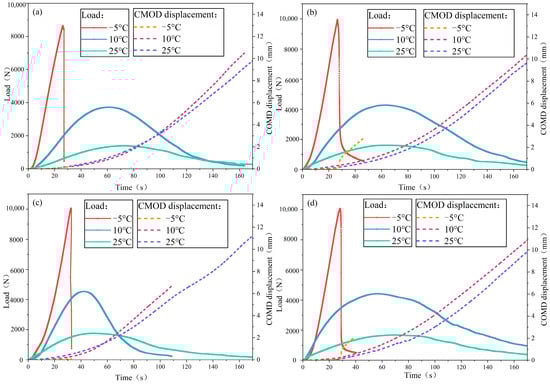 Time is the key factor of fracture toughness in a semi-circular bending test, and CMOD displacement is also an important evaluation index of fracture opening rate of specimens. The longer the fracture process, the smaller the crack opening rate of specimens and the stronger the low-temperature fracture toughness of asphalt mixture. Therefore, in this part, the load–time curve and CMOD displacement–time curve of different types of asphalt mixtures at different temperatures in SCB test were combined and analyzed, taking the representative data in parallel test as an example, and the results are shown in Figure 6.