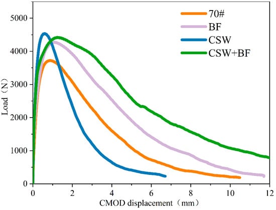 As can be seen from Figure 7, with the increase of CMOD displacement, the load on SCB specimens first rises and then falls, and the slope before peak load is greater than that after peak load. The order of peak load of different mixtures is CSW > CSW + BF > BF > 70#, which shows that CSW and BF can improve the tensile strength of asphalt mixture matrix, and the material is not easy to produce through cracks under the action of temperature stress and load. However, the CMOD displacement corresponding to the peak load of CSW decreases, which shows that CSW will reduce the flexural-tensile strain of asphalt mixture and increase the stiffness of asphalt, which is unfavorable to the crack toughness of materials at low temperature. The CMOD displacement of BF corresponding to the peak load of CSW + BF is large, which shows that fiber materials can toughen asphalt concrete and reduce its crack propagation speed.