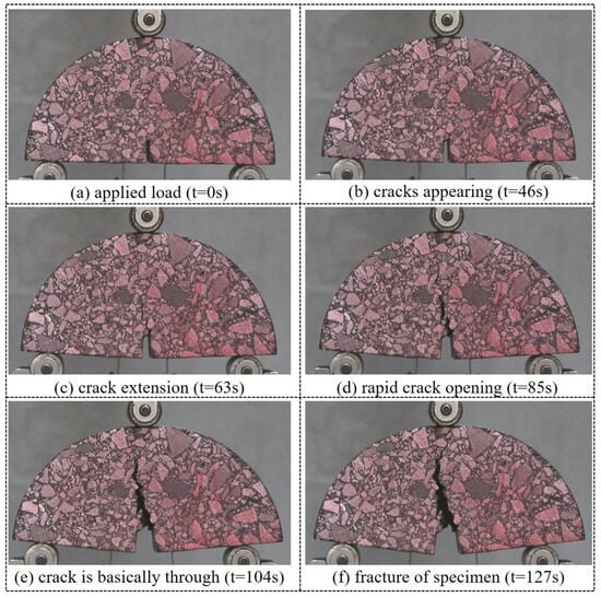 In this study, the Potplayer video player v1.6.63891 was used to capture the images of SCB specimens at different cracking moments in the video of specimen cracking process. Taking the cracking process of CSW + BF modified asphalt mixture at 10 °C as an example, six representative moments were selected as the crack state images at different cracking stages, as shown in Figure 8. It can be found that macro cracks did not appear in the specimen for a long time after loading, and cracks appeared for the first time after loading for 52 s, but they were not clear, indicating that micro cracks had been produced. After loading for 84 s, the specimen has a clear crack propagation path, which indicates that it is in the stress attenuation stage after peak load, and at this time, the micro-cracks have expanded upward, and micro-cracks interweave at the upper part of the specimen. After loading for 103 s, the surface crack of the specimen has spread more than half, and the middle crack at the bottom has obvious deformation, and the crack width increases rapidly at this stage. After loading for 132 s, the cracks have basically penetrated, but the residual load of the material is still large, which does not meet the test minimum load condition and continues to be loaded. After loading for 164 s, the crack runs up to the top, which means that the specimen is completely broken.