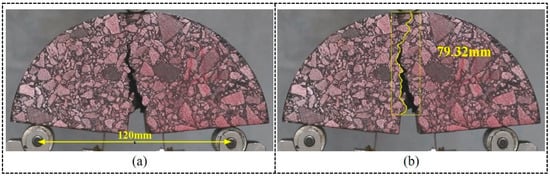 In this study, an electronic extensometer produced by Steel Research and Testing Technology Co., Ltd., based in Shanghai, China, was used to record the central mouth opening displacement (CMOD) of SCB specimens. The extensometer model was YYU-10/25, with a range of 10 mm. To ensure that the crack path of the specimen was clearly recorded during the test, the surface of the prepared SCB specimen was manually dyed with red hand paint, as shown in Figure 4a,b. The extensometer was designed to move in real time with the opening of the middle seam, which was achieved by fixing an extended staple on both sides of the seam with AB glue and securing the extensometer clip to the staple with a rubber band.