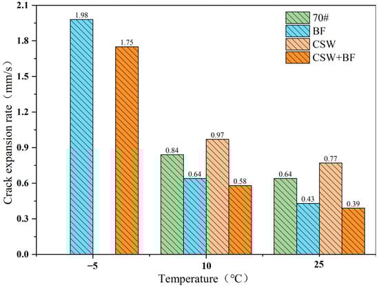 Drawing from the analyses in Section 3.1.1 and Section 3.1.2, the lowest crack propagation speed observed in the CSW + BF mixture may be attributed to the synergistic interaction between the different scales of CSW and BF. This synergy enhances the stability and toughness of the mixture, resulting in a slower crack propagation speed. It is also worth noting that at −5 °C, both 70# asphalt and CSW exhibit brittle fracture, characterized by a short fracture process and distorted crack propagation speed data, which have not been included in the figure.