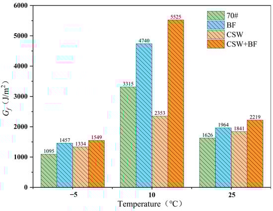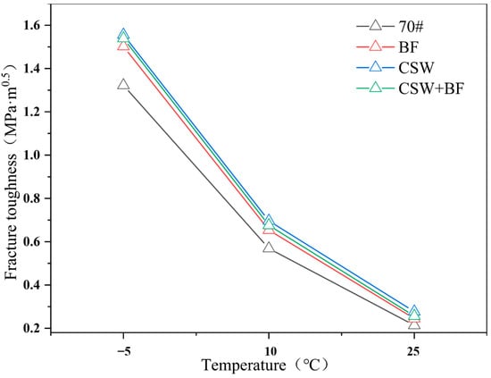 Figure 11 depicts the change curves of fracture toughness of different mixture specimens at different temperatures. It can be found that the fracture toughness decreases significantly with the decrease of temperature, and the stiffness modulus of the mixture is improved at low temperature, which makes the mixture absorb more energy during the fracture process, indicating that the lower the temperature, the stronger the bearing capacity of the mixture. Among different types of asphalt mixtures, the fracture toughness of 70# asphalt is the worst, and that of CSW is the largest, which shows that CSW improves the low-temperature stiffness of asphalt mixtures and makes the physical properties of materials mainly elastic. The fracture toughness of BF and CSW + BF is similar to that of CSW, and the crack strength of the mixture is obviously improved. In addition, the fracture toughness is determined by the peak load Pmax without considering the displacement factor of specimen fracture, which cannot fully reflect the advantages and disadvantages of different types of asphalt mixtures.