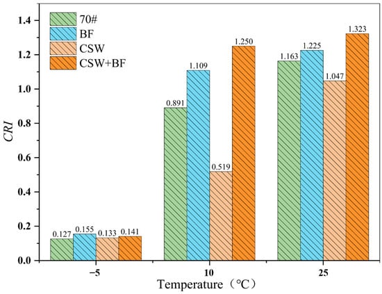Figure 13 describes the change of CRI of different mixture specimens at different temperatures. It can be seen that with the increase in temperature, the CRI of the mixture shows an upward trend, and the CRI of CSW + BF is the largest at 10 °C and 25 °C, indicating that it has strong toughness and good crack resistance. The overall order of CRI value is: CSW + BF > BF > 70# > CSW, which shows that mixing CSW alone will reduce the toughness of asphalt mixture, but hybrid fiber will improve the overall crack resistance of asphalt mixture. This is different from the addition of single material characteristics. The mixing law in composite material theory has many application conditions, and many factors need to be considered in the performance prediction of fiber reinforced concrete materials.
