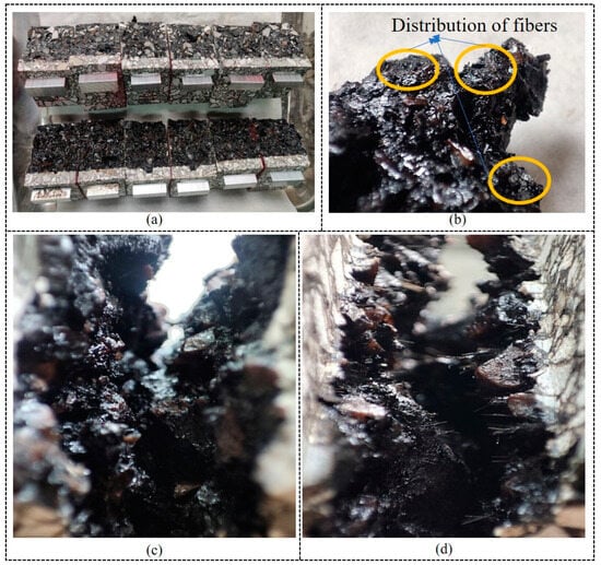 (a) Fracture interface of SCB specimen; (b) fiber distribution of CSW + BF modified mixture specimen; (c) interface between two sides of crack of 70# modified mixture specimen; (d) interface between two sides of crack of CSW + BF modified mixture specimen.