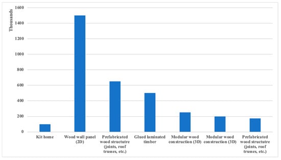 Regarding the value of construction projects completed outside Quebec by each respondent, the highest-valued project (exceeding CAD 1 million) was undertaken by the wood wall panel (2D) construction company. On the other hand, the lowest-valued project (less than CAD 200 thousand) was conducted by the kit home company, as shown in Figure 2. Two companies that manufacture modular wooden constructions have construction project values abroad that are close to each other.