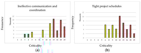 Figure 4 shows the criticality distributions of two operational risk factors. Each bar represents a criticality value. In addition, each color represents a level of criticality. Green represents low criticality, yellow represents moderate criticality and red represents high criticality. In this case, for “ineffective communication and coordination”, the criticality value 15 had the highest frequency (>10,000). “Tight project schedules” had the second highest frequency of high criticality, and it did not have a frequency of low criticality. It had a criticality value of 12 most frequently (>10,000).