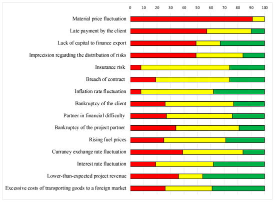 The “exchange rate fluctuation” risk factor was said to be moderately to highly critical. It is a risk that is usually considered during project planning, but it must still be monitored during project execution. Financial risks are more critical. This result confirms research by Akintoye and MacLeod and also Naderpour et al. [,]. Financial risk influences the cash flows of construction projects. Not surprisingly, this source of risk is very important to companies in the timber construction sector.