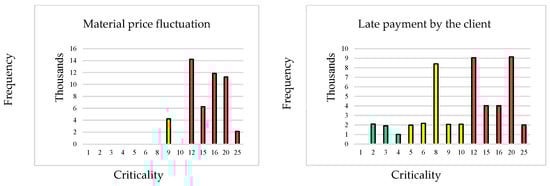 Figure 6 shows the criticality distributions of the two financial risk factors with the highest level of criticality. Each color represents a level of criticality. Green represents low criticality, yellow represents moderate criticality and red represents high criticality. The risk of “material price fluctuation” was most critical. Furthermore, there was no frequency of low criticality levels. It had a criticality value of 12 most frequently (>14,000). On the other hand, “late payment by the client” was critical but had a frequency of all three levels of criticality. It had a criticality value of 20 most frequently (>9000).