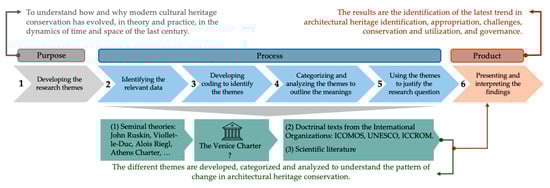 Due to the wide scope of this review, the Result section is structured into three parts. It refers to the Venice Charter as a pivotal point in the process of the transformation of the intellectual, perceptual, and practical understanding of the modern conservation of architectural heritage. Therefore, in the first part, it discusses the main ideologies that have influenced the theoretical underpinnings of the Venice Charter; the second part elaborates on what the Venice Charter teaches us; the third part discusses the recent evolutions in conservation understanding from the establishment of the Venice Charter until now, within institutional and recent scholarship. Figure 1 demonstrates the steps used in this research method.