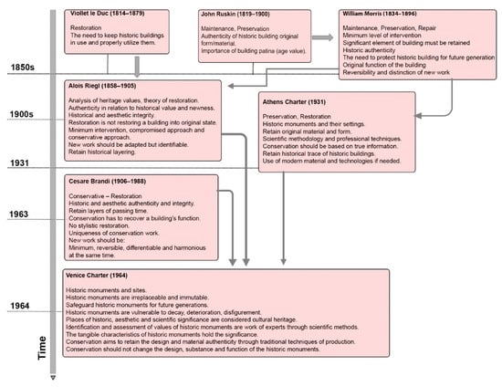 These concepts and principles soon reappeared in the Venice Charter [], shaping the bases of the modern theory of conservation. Hence, the philosophical recognition of the particularity of artistic works, including architecture, as unique creations by individuals became the basis for the description of the modern understanding of conservation and restoration. Thenceforth, the legitimacy of restoration as a practice that simply re-establishes or returns to an earlier form was disregarded; rather, identifying the place in its actual state, the original intention of the designer, the purpose for which it was built, the historical transformation it has gone through, and the patina and physical condition of the historical building define the criteria for monument conservation. A summary of the theories and concepts that influenced the principles of the Venice Charter 1964 is presented in Figure 2.