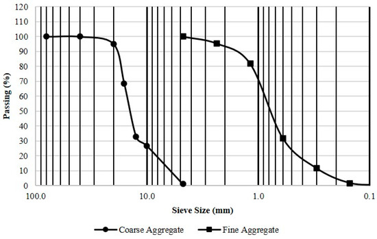 River sand from zone II, as specified by IS:383-2016 [25], served as the fine aggregates. Coarse aggregates were composed of crushed granite gravels with nominal sizes of 20 mm and 12.5 mm, blended in a ratio of 3:2. The specific gravities of the fine and coarse aggregates were 2.70 and 2.65, respectively. Figure 1 depicts the grading curve of coarse aggregate and fine aggregate used for the present study.