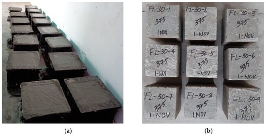 All the ingredients were mixed, and then water was added to make a consistent mixture. Three layers of concrete were poured into moulds, and the voids were eliminated by vibrating the material. After 24 h of casting, the samples of all four concrete samples were taken out of the moulds, and each set of the four concrete mixtures was divided into two groups. One group of samples was treated with ACC for 6, 24, and 72 h at 10% CO2 concentration, at 35 °C temperature, and at 70% relative humidity, while the other group was water-cured for the same amount of time as the ACC. For the concrete sample ACC, 99.9% pure CO2 was used from a gas cylinder with pressure regulation. Figure 3a,b shows the preparation and curing of samples.
