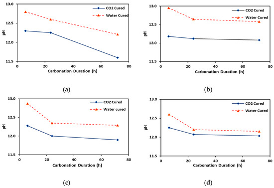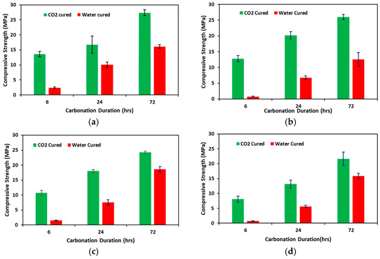 The mechanical performance of concrete at 6, 24, and 72 h after ACC was examined in the study in relation to water curing. 100-mm cube specimens were examined to assess the compressive strength of the concrete. Figure 4a–d shows the results of compressive strength at different hours of carbonation curing and compared with water-cured specimens. The data suggest that the compressive strength of the ACC specimens was higher than that of the water-cured specimens with a percentage increase of 70.46%, 111.28%, 30.36%, and 36.69% for the M1, M2, M3 and M4 sample, respectively, after 72 h. Furthermore, mixes M1 and M2 during 72 h of carbonation cure reached the desired strength. Previous researchers reported that enhanced strength development is due to the higher rate of carbonation reaction, which turns C2S and C3S into CaCO3 and C-S-H gel; thus, ACC specimens have better strength development [19]. Furthermore, the hydration event that yields Ca(OH)2 is transformed into thermodynamically stable CaCO3 by the carbonation reaction that occurs during ACC.