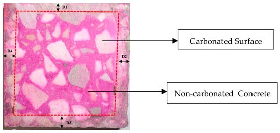 Figure 5 shows the image of a typical phenolphthalein-stained concrete specimen after ACC. During the phenolphthalein test for the calculation of carbonation depth, it is observed that the carbonation depth of all the samples is below 5 mm. Carbonation depth was calculated using Equation (5) [26]. So, the chance of carbonation-induced corrosion is negligible. This statement is verified using pH analysis. pH results are depicted in Figure 6. In the pH analysis, even though there is a drop in the pH of ACC samples compared to water-cured samples, it is well above 10, which is in the tolerable limit to avoid deterioration of passivating film over the rebar [10,11,27].
