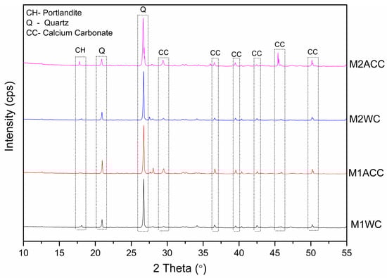 XRD is a crucial technique for analyzing hydrated cement concrete samples in both quantitative and qualitative ways. This analysis can detect the mineralogical changes, if any, that can occur due to carbonation. By studying XRD patterns of carbonated and non-carbonated concrete samples, it is possible to determine the extent of carbonation. Bragg’s law is the foundation of XRD. By analyzing the results of the XRD test, the angle at which the wave was diffracted and the intensity of the X-ray can be determined [28]. In Figure 7, the XRD patterns of the M1 and M2 samples subjected to accelerated carbonation curing and water curing are depicted. The graphs reveal a notable increase in the peaks corresponding to CaCO3 and a decrease in those related to Ca(OH)2 following carbonation curing. This phenomenon can be attributed to the reaction between cement hydration products and CO2.
