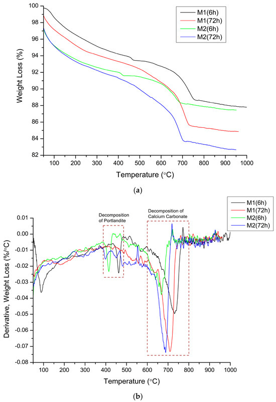 (a) TGA (b) DTG analysis of carbonation cured M1 and M2 sample for 6 h and 72 h.