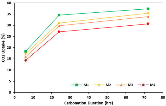 It is axiomatic that the level of relative humidity in concrete-based products has a significant impact on the degree of carbonation. Reduced levels of relative humidity can expedite the carbonation process, as a dry environment allows greater CO2 diffusion in the concrete. Both experimental and modelling data suggest that, to attain carbonation, the referred relative humidity range of 50% to 70% is required [20]. At this level, the concrete is neither too dry to restrict carbonation reactions, nor too damp for capillary pores to be fully saturated, which limits CO2 diffusion [21]. Another prime variable that affects the amount of carbon absorbed during carbonation curing is the length of time exposed to CO2. According to earlier research, most carbonation reactions seem to happen in the first 6 h of curing. However, this result may vary depending on the concrete mixture design and curing settings [22].