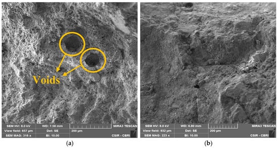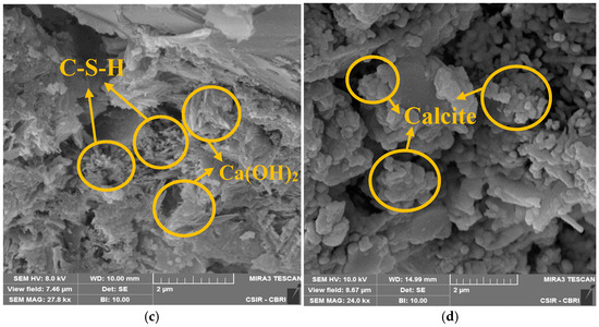 In the SEM image of water-cured concrete (Figure 10a,c), the microstructure shows the well-hydrated cement particles surrounded by a dense matrix of hydrated cement paste. The images display a uniform distribution of voids. The calcium hydroxide and calcium silicate hydrate gel formed as a result of hydration appear under the higher-magnification SEM images [30]. In contrast, Figure 10b,d concrete subjected to carbonation curing exhibit alterations in its microstructure due to the ingress of CO2. Carbonation leads to the dissolution of Ca(OH)2 and the formation of CaCO3, resulting in a decrease in voids due to CaCO3 precipitation within the pores, leading to a reduction in porosity and an increase in concrete density [31]. This outcome is consistent with the previous research findings. The CaCO3 crystals that formed occupy the voids and the small fractures within the interfacial transition zone (ITZ), which in turn can help to minimize the imperfections of the ITZ [28,29].