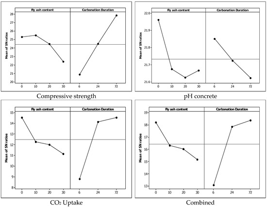 From Table 3 it is observed that Carbonation Duration has great importance on compressive strength (85.50%) and CO2 uptake (75.26%) than Flyash Content, whereas the pH of concrete was highly dependent on Flyash Content (59.72%) than Carbonation Duration. The analysis indicates that the experimental error was very low-level. The larger F value indicates that the variation of the control parameters makes a big change in the performance characteristics. The p-Level value is less than 0.05, which indicates that both the Flyash Content and Carbonation Duration and retention period are significant. Figure 11 shows the variation of means of the S/N ratio with levels of input parameters.