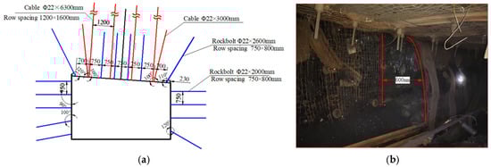 The roadway is driven along the roof of the coal seam, with a net width of 5.4 m and a height of 3.4 m, utilizing anchor and mesh support. The specifications for the side rockbolts are Φ22 × 2400 mm, with five rockbolts in the upper side and four rockbolts in the lower side, spaced at intervals of 750 × 800 mm. The rockbolts are torqued to 300 N·m. The support parameters are illustrated in Figure 1a, and the field deformations are depicted in Figure 1b.