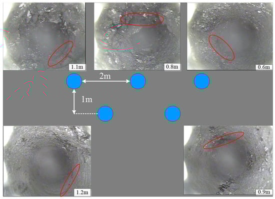 During the mining period, influenced by high in situ stress and mining-induced stress at depth, the surrounding rock of the Ji-15-23090 headgate has become fragmented. In order to view the broken surrounding rock of the roadway, boreholes are arranged in the side of the roadway for peeping. Figure 2 shows the arrangement and observation of boreholes. The blue circle in this Figure shows five boreholes, and five photos show the observation of each borehole.