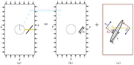 Assume the surrounding rock is a homogeneous elastic body under hydrostatic pressure, and ignore the influence of the crack on the stress field distribution [28,29]. The angle between the rockbolt (represented by yellow lines) and the crack is α, and the crack length is 2a. In linear elasticity problems, the stress fields generated by each load can be calculated linearly. Therefore, the model can be decomposed into the in situ stress influence model (Figure 3b) and the rockbolt axial force influence model (Figure 3c).