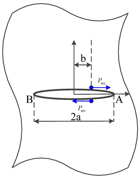 Under compressive and shear forces, crack initiation is influenced by the decomposed axial force parallel to its surface. Therefore, the rockbolt axial force influence model can be converted into a model of a crack in an infinite plate subjected to a concentrated shear force (Figure 4).