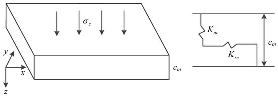 Based on the fracture constituent elements, a model is established, as shown in Figure 6, to analyze the relationship between the normal stress on the crack surface and the crack opening, assuming that the crack is subjected to a uniformly distributed normal stress (Pmy), denoted as , the crack opening is cm, where cm = 2c, and the elastic constants of the crack are λc and Gc. The normal stiffness of the crack is Knc, and the shear stiffness is Ksc.