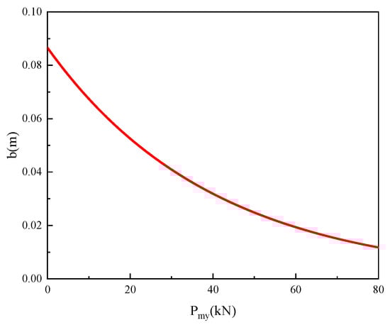 Letting Knc = 200 GPa/m, α = 60°, c = 0.1 m, the evolution curve for b can be calculated by substituting these values into Equation (8), as shown in Figure 7. The trend indicates that the anchor point of the rockbolt shifts towards the center of the crack as the pre-tension increases.