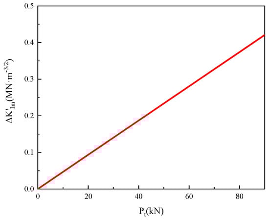 The difference in stress intensity factor before and after anchoring represents the stress intensity factor generated by the axial force of the rockbolt, denoted as . Based on Equation (10), we programmed this relationship in Matlab (V2016) and used the data from Table 1 for calculations, generating the evolution curve of the stress intensity factor difference under the influence of pre-tension, as shown in Figure 8.