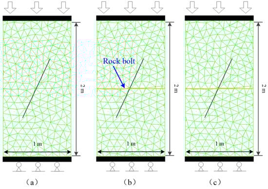At present, pre-tension is typically applied to rockbolts through torque in underground construction. A pre-tension torque of 300–400 N·m corresponds to a pre-tension of approximately 30–40 kN [34]. This study uses 40 kN, equivalent to a load of 0.105 MPa. For HRB335 left-hand threaded steel rockbolts with a diameter of 22 mm, 70% of the yield strength is approximately 90 kN. This value is used in this study as the high pre-tension application value, which translates to a load of 0.237 MPa. To analyze the crack-arresting effect of rockbolts under different pre-tension, three groups of comparative simulations are set up: uniaxial compression of a crack sample without anchoring, uniaxial compression of a crack sample with low-pre-tensioned rockbolt anchoring, and uniaxial compression of a crack sample with high-pre-tensioned rockbolt anchoring (Table 2).