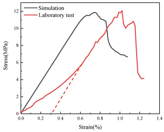 A 1 m × 2 m model is established in UDEC for calibration. The block and contact surfaces adopt the strain-softening model and coulomb slip model, respectively. The bottom of the model is fixed, and a vertical load is applied to the top at a rate of 0.02 m/s. The trial-and-error method is used to continuously calibrate the model parameters. The calibration results are shown in Figure 10. The uniaxial compressive strength of the rock specimen measured by the laboratory is 12.1 MPa, and the elastic modulus is 1.8 GPa. Numerical simulation shows that the uniaxial compressive strength of the rock specimen is 11.9 MPa, and the elastic modulus is 1.8 GPa. The data error between the two is within 2%. Therefore, it can be considered that there is a high degree of agreement between the stress–strain curve of the calibrated numerical model and the experimental test results. The final rock simulation parameters determined are listed in Table 3.
