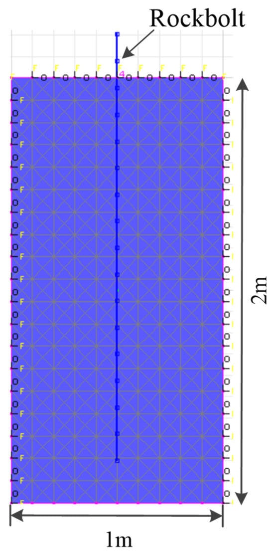 In UDEC, a numerical model for the rockbolt pull-out test was established, as shown in Figure 11. The model employs full-length anchoring to embed the rockbolt into the rock sample. The rock parameters used are calibrated rock parameters. A rockbolt element simulating a Φ22 mm × 2000 mm rockbolt is utilized. The model dimensions are set as width × height = 1 m × 2 m. The test involves setting up 17 nodes along the rockbolt, with nodes 1 to 15 embedded within the rock sample, node 16 near the surface of the sample, and node 17 outside the sample. A speed of 0.08 m/s is applied to node 17 for the pull-out test, with the model’s upper surface fixed during computation. FISH language is used to monitor axial load and displacement of the rockbolt.