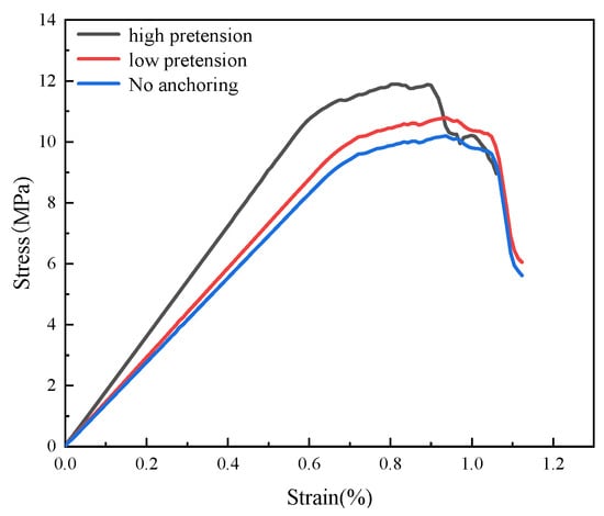 The stress–strain curves of specimens under different pre-tension are shown in Figure 13. Using the specimen without anchoring as a reference, it is evident that the mechanical properties of specimens reinforced with different pre-tensioned rockbolts are improved. Specifically, high pre-tensions applied to the rockbolt demonstrate a more pronounced enhancement effect. The peak strength of the specimen increases from 10.2 MPa to 12.5 MPa, marking a 22.5% improvement, while the elastic modulus increases from 1.38 GPa to 1.82 GPa, indicating a 31.9% enhancement. In contrast, the use of low pre-tensions results in increases of 5.9% and 7.2% in peak strength and elastic modulus, respectively. Statistical data suggests that high pre-tensions applied by rockbolts achieve better anchoring effects in rock masses, effectively strengthening rock mass integrity and mitigating the adverse effects of cracks on rock mechanical properties.