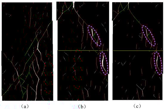 Figure 14b,c shows the damage after low-pre-tensioned and high-pre-tensioned support, respectively. It is observed that the rockbolt support alters the crack propagation pattern and failure mode of the specimen. Since the rockbolt passes through the pre-existing crack in the specimen, no expansion occurs at this position; instead, the main crack forms from the upper 1/3 boundary to the right boundary of the specimen, exhibiting a splitting failure pattern. Comparing circled cracks, it is evident that under high pre-tension, the extent of crack opening is significantly reduced.