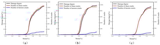 The evolution curves of crack number and damage degree of cracked specimens with different pre-tension (a) without anchoring; (b) low pre-tension; (c) high pre-tension.