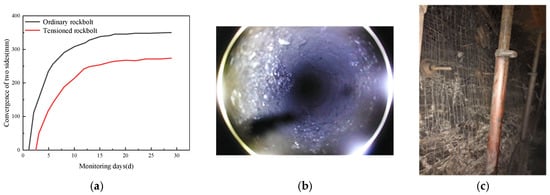 Field observation results. (a) Convergence of two sides. (b) Borehole inspection of the sidewalls in the experimental section. (c) Support effectiveness.