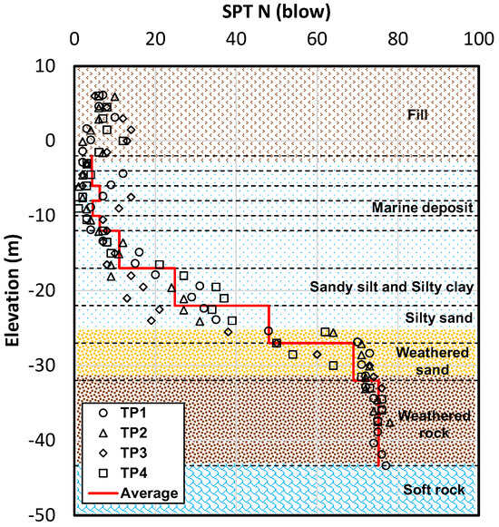As mentioned above, a full-scale lateral pile load test was conducted in the Incheon Free Economic Zone (IFEZ) in the Songdo area of South Korea. In particular, the west coast of the Korean peninsula exhibits an unusual characteristic, with tide ranges reaching approximately 8 m during ebb and flow. Therefore, this area features a significantly deeper marine deposit layer compared to other locations. To investigate the subgrade conditions of the test site, borehole tests and Standard Penetration Tests (SPTs) were consistently performed, as shown in Figure 2.
