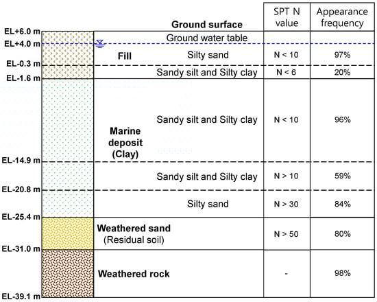 Each symbol represents the SPT (Standard Penetration Test) result obtained from a specific borehole, while the solid line indicates the average SPT value for each layer. Based on the results derived from boring holes, the layers of the test area can be broadly categorized into dredged fill, marine deposit, weathered soil, weathered rock, soft rock, and hard rock layers. Figure 3 provides more detailed information on the ground conditions and frequency of occurrence in the area, while representative engineering properties of the Songdo area are summarized in Table 1, based on field and laboratory experiments.