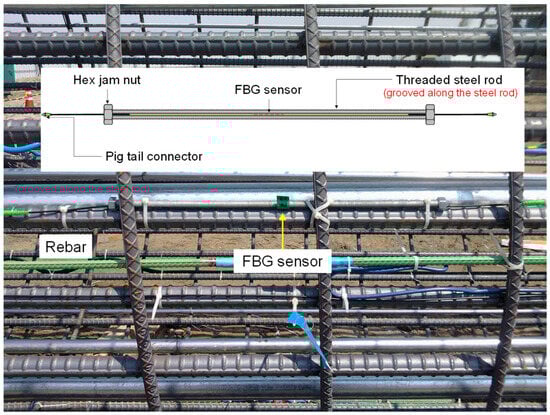 To measure the axial strain of the laterally loaded pile in this test, unit-type FBG sensors designed for the drilled shaft were employed, as shown in Figure 4. In the fabrication of the unit-type FBG sensor, for the integration and behavior with the sensor after curing concrete, a threaded iron rod was used and a groove was made on it, and the raw FBG sensor was bonded with a strong adhesive before the groove was filled with epoxy in the groove. In addition, hex jam nuts were connected at both ends of the iron rod to increase contact with the concrete. The unit-type FBG sensors attached to the compression and tensile axes of the test pile were symmetrically installed on rebars at the specified level, as shown in Figure 5; these FBG sensors measured the bending strain with depth.