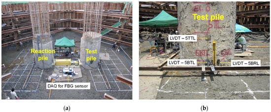 Between the reaction and test piles, a hydraulic jack, positioned at a loading elevation of −2 m (consistent with level 10 where the FBG sensor was installed), applied lateral loads to the test pile, with a load cell measuring the exact amount of applied force. The test pile was gradually loaded, beginning at 0 kN and increasing by 150 kN increments, until it reached 1350 kN. Afterward, the hydraulic jack was reset. Upon reapplying the 1350 kN load, the test pile was further loaded in increments of 90 kN from 1530 kN to 1800 kN. The pile head deflection was measured using linear variable differential transformers (LVDTs) mounted on a reference beam, which ensures accurate displacement measurements by remaining stationary (see Figure 7). A total of three LVDTs were installed. Pile head displacement at the loading height, divided into left and right to account for eccentricity. An additional LVDT was installed at −1 m elevation to more accurately evaluate the pile head displacement. The measured values from these three locations were averaged to assess the deflection of the pile head. For analysis purposes, it was assumed that the pile head has constant bending stiffness (EI) over the entire length.