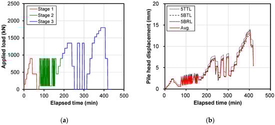 Figure 8a presents the applied load on the test pile over time during the lateral load test. The loading process began with gradual increments of 150 kN, eventually reaching the design load of 900 kN. Following this, cyclic loading was performed to evaluate the pile’s durability under repeated stress. After the cyclic tests, the load was further increased to explore the ultimate load capacity, culminating in a final applied load of 1800 kN. The figure below captures the progression of loading, including the critical reset of the hydraulic jack, which allowed for further load increments and provided insights into the pile’s response under varying conditions.