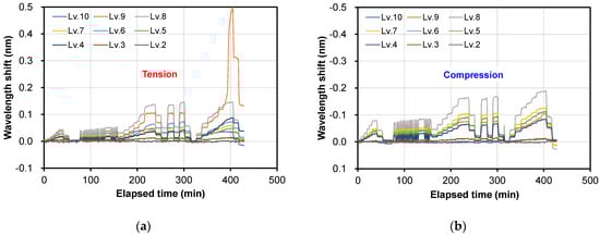 Figure 10 displays the wavelength shift by depth measured by the FBG sensor as the pile head was incrementally loaded up to 1800 kN. This wavelength shift is referred to as ‘bending strain’, as it reflects the axial strain induced by the pile’s bending under lateral loading. The bending strain was evaluated using these wavelength measurements, and Figure 11a presents the bending strain caused by the horizontal movement of the test pile at varying depths. The figure clearly depicts the tensile and compression sides, with the solid red line representing the average values across these axes.